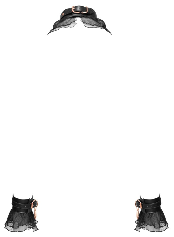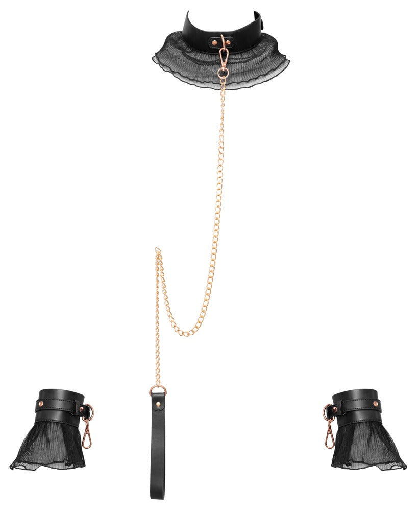 Sættet indeholder et halsbånd med aftagelig snor samt matchende håndjern, designet i realistisk læderlook med fine plisserede blonder og guldfarvede metaldetaljer – en luksuriøs balance mellem styrke og finesse.