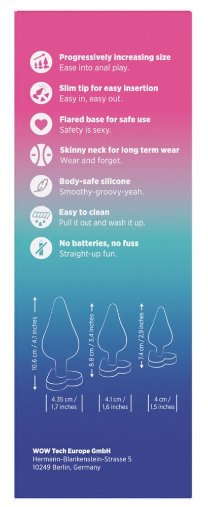 Den kegleformede krop med en blød, tilspidset spids gør indføringen nem og begyndervenlig, mens de hjerteformede stoppere sørger for sikker brug og et legende, charmerende touch. Med tre forskellige størrelser og farver (grøn, pink og blå) er dette sæt ideelt til progressiv analtræning, stræk og stimulation.
