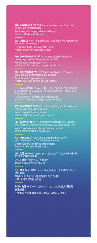 Luster Anal Training Kit fra ROMP er et stilfuldt 3-delt sæt, perfekt til både nybegyndere og dem, der ønsker at udforske anal leg med ekstra komfort og selvtillid. Hver plug er fremstillet af fløjlsblød silicone med en metallisk shimmer-finish, der giver et glamourøst look, samtidig med at materialet er kropssikkert, fleksibelt og behageligt.