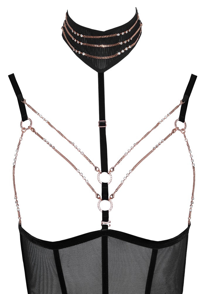 Denne luksuriøse, åbne body fra Abierta Fina er skabt til dig, der ønsker et sensuelt look med stil, struktur og detaljer, der føles eksklusive. Den gennemsigtige powernet kombineret med bløde velvet-stropper giver kroppen et elegant løft, mens de roséguld-farvede kæder tilføjer en diskret glans, du selv bestemmer intensiteten af — alle kæder kan nemlig tages af.