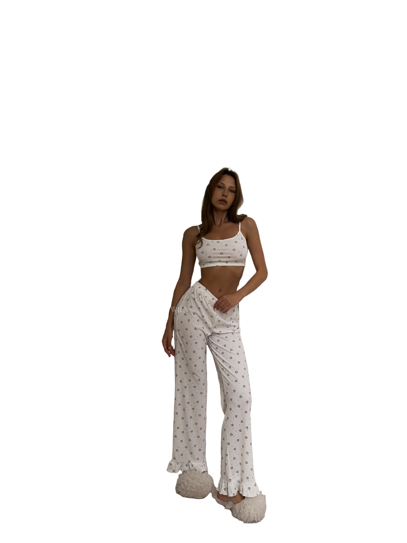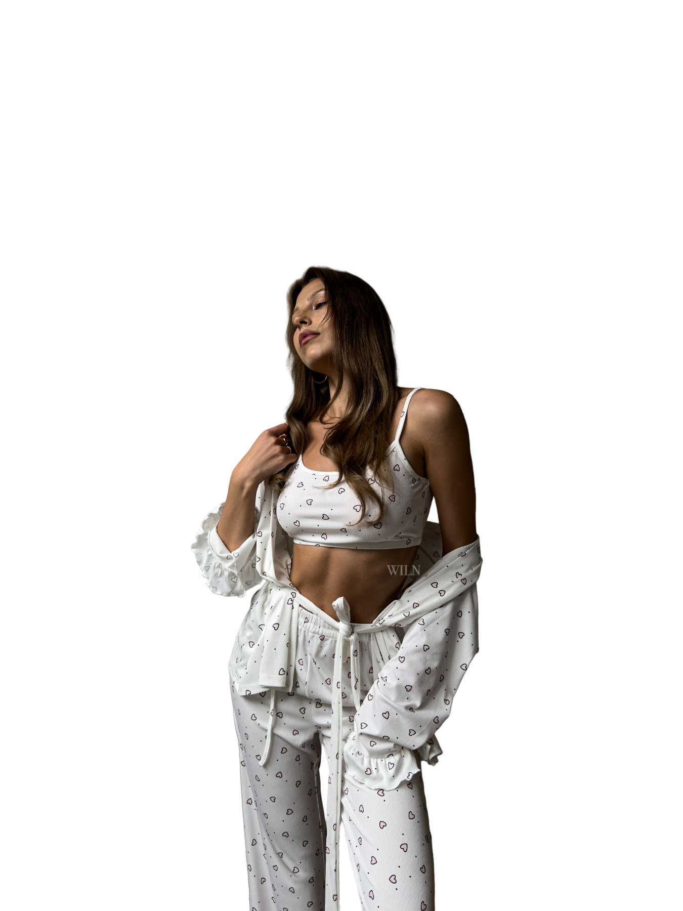 3-delt loungesæt: cropped top, ruffle-morgenkåbe og matchende bukser