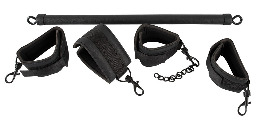 Sættet inkluderer blødt polstrede hånd- og fodmanchetter i imitationlæder, som nemt justeres med hook-and-loop lukninger for en sikker og behagelig pasform.