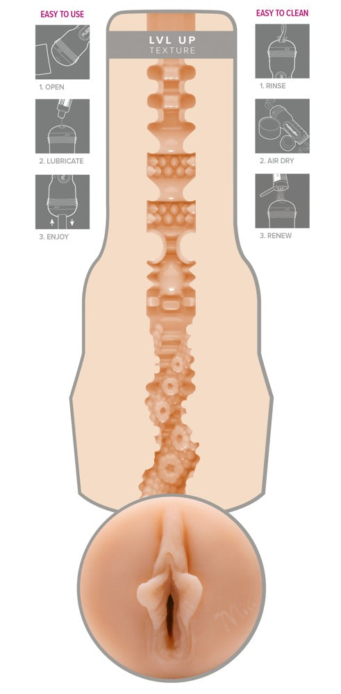 Mia Malkova LVL Up fra Fleshlight er en realistisk masturbator skabt med fokus på detaljer, komfort og en naturtro fornemmelse. Den leveres i et perlehvidt etui med låg, der sikrer privat opbevaring, mens den indvendige udformning er inspireret af Mia Malkovas intime former.