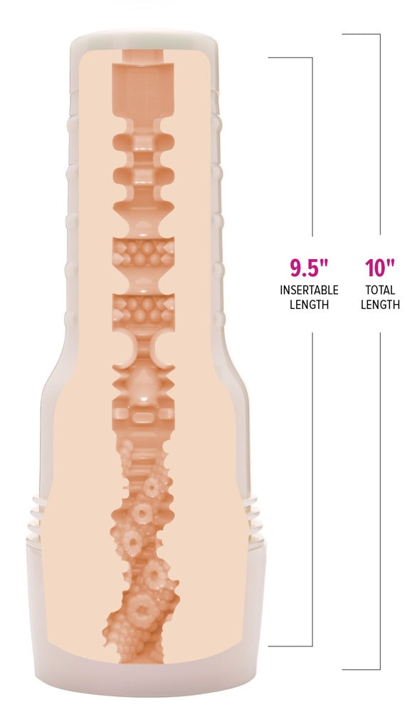 Indersiden består af en struktureret nydelseskanal med prikker og riller i varierende størrelser, som giver rytme og variation. Materialet er fremstillet i SuperSkin™ (TPE) — blødt, hudlignende og fleksibelt — for en behagelig og jævn oplevelse. En diskret signaturdetalje ved åbningen fuldender det eksklusive udtryk.
